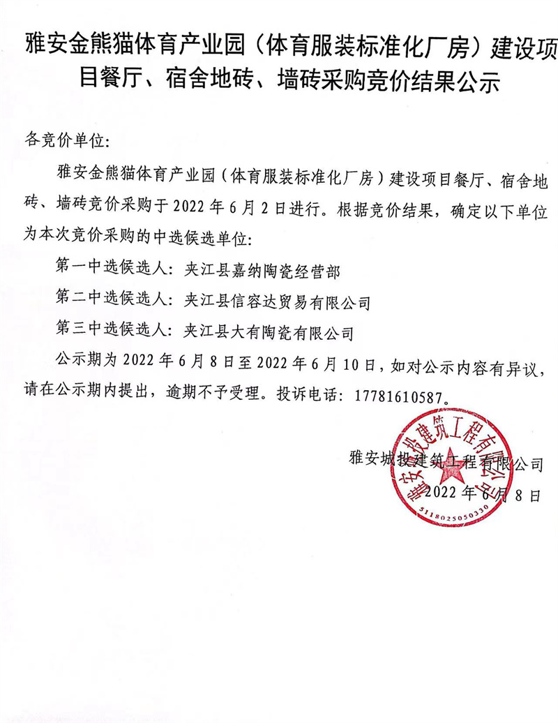 雅安金熊貓?bào)w育產(chǎn)業(yè)園(體育服裝標(biāo)準(zhǔn)化廠房)建設(shè)項(xiàng)目餐廳、宿舍地磚、墻磚競(jìng)價(jià)結(jié)果公示