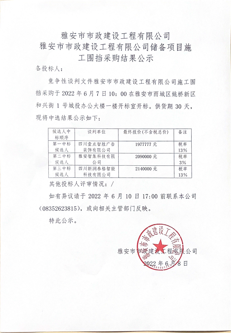 雅安市市政建設(shè)工程有限公司儲備項目施工圍擋招采結(jié)果公示