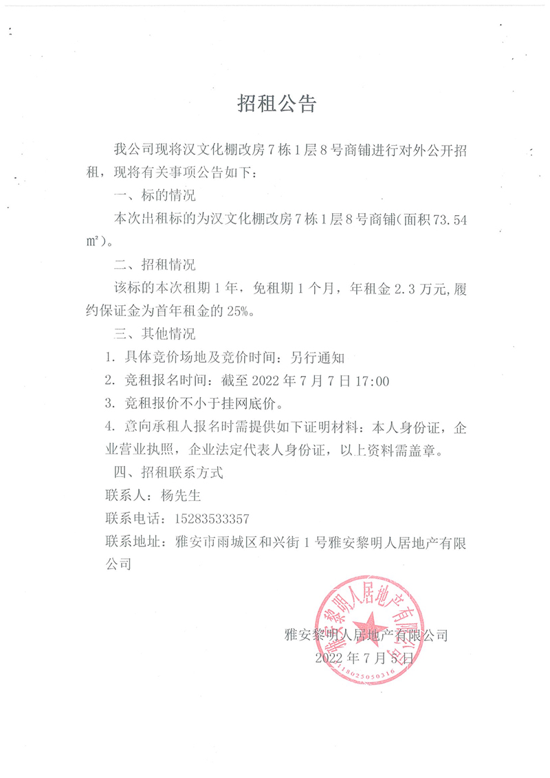 漢文化棚改房7幢1層8號(hào)商鋪對(duì)外招租公告
