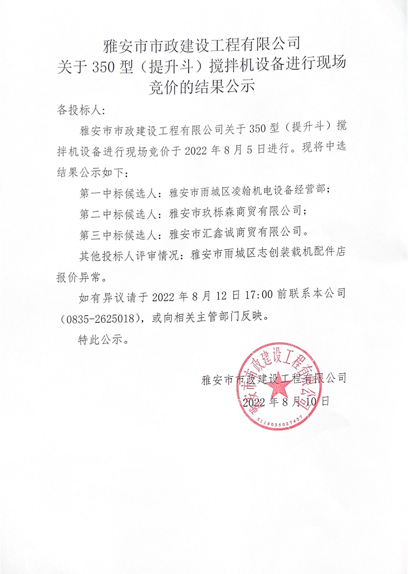 關(guān)于350型(提升斗)攪拌機設(shè)備進行現(xiàn)場競價的結(jié)果公示