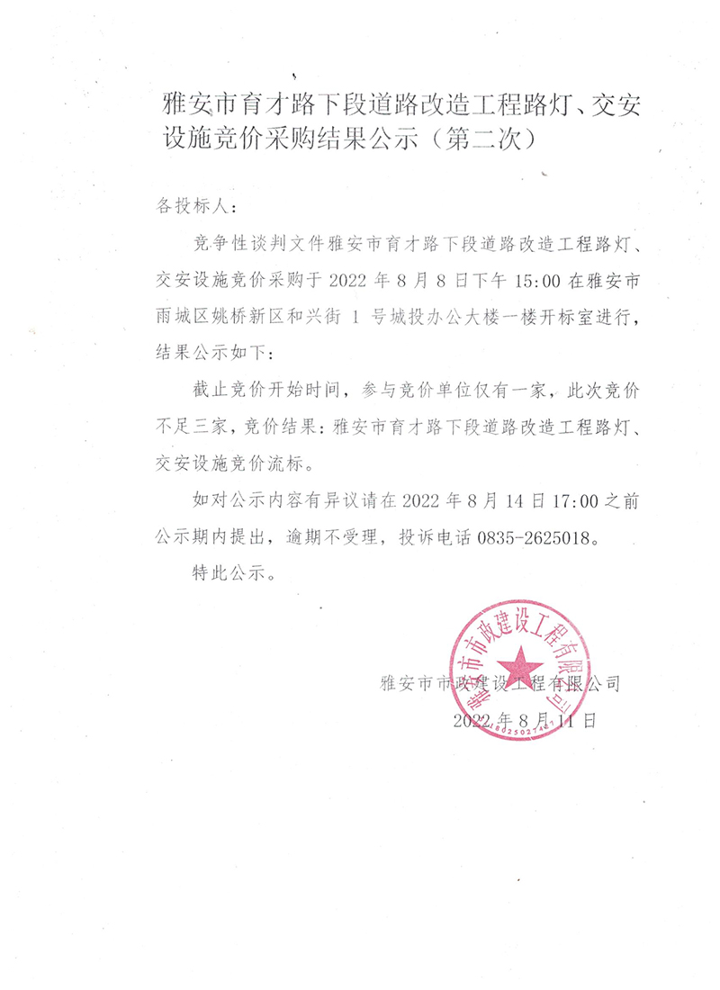 雅安市育才路下段道路改造工程路燈、交安設(shè)施競(jìng)價(jià)采購結(jié)果公示(第二次)