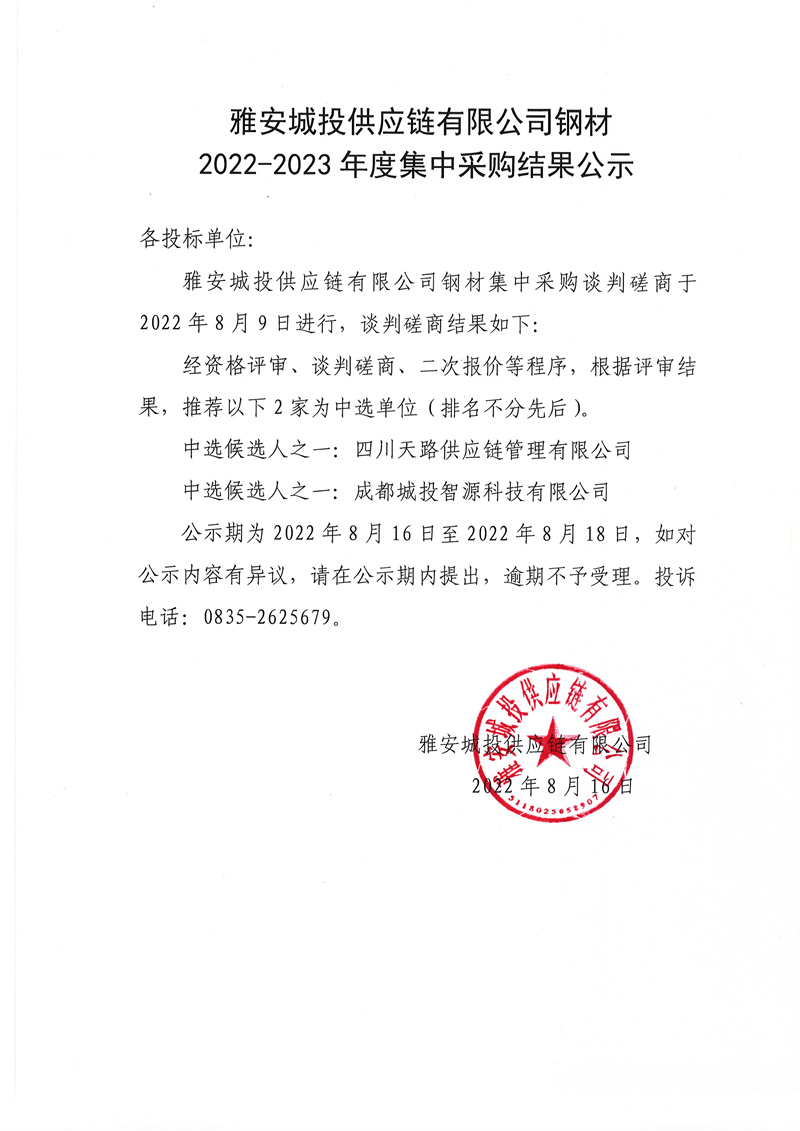 雅安城投供應鏈有限公司鋼材2022-2023年度集中采購結果公示