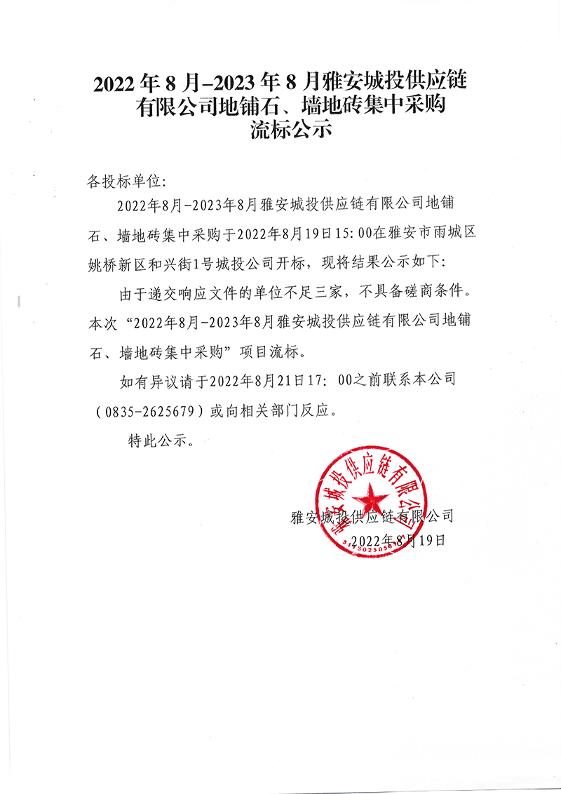 2022年8月-2023年8月雅安城投供應鏈有限公司地鋪石、墻地磚集中采購流標公示
