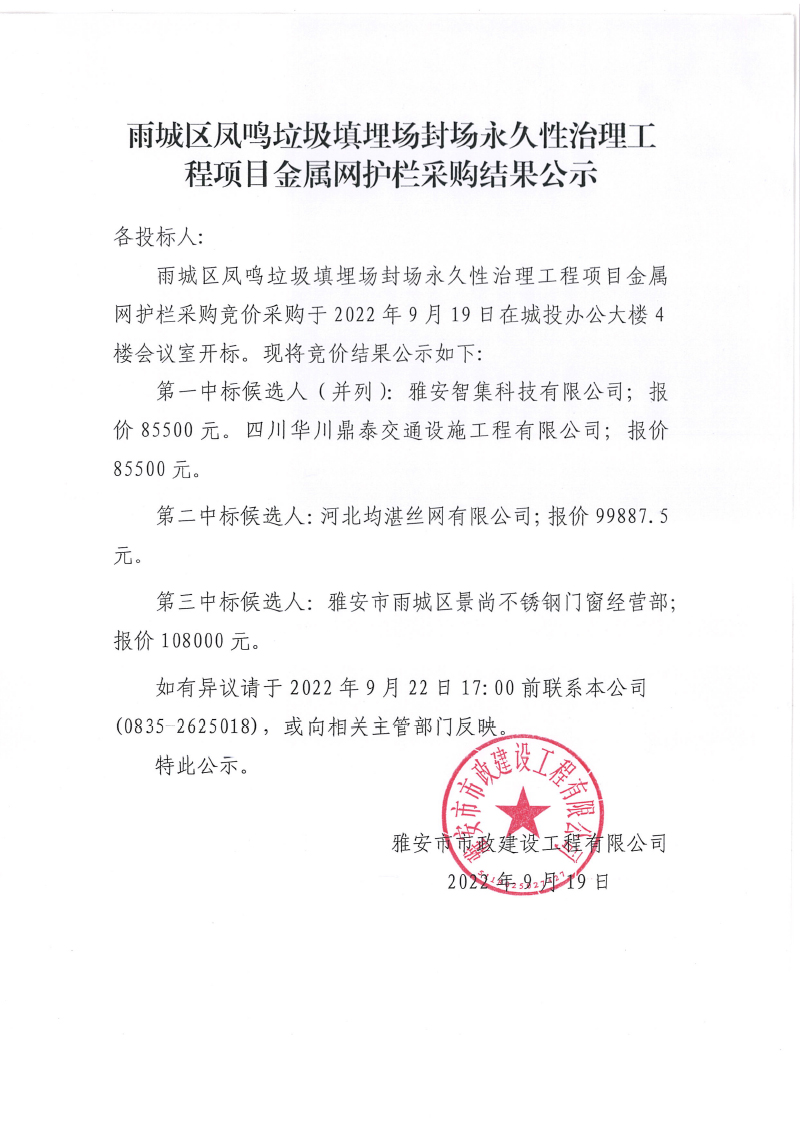 雨城區(qū)鳳鳴垃圾填埋場(chǎng)永久性封場(chǎng)治理工程項(xiàng)目金屬網(wǎng)護(hù)欄采購結(jié)果公示