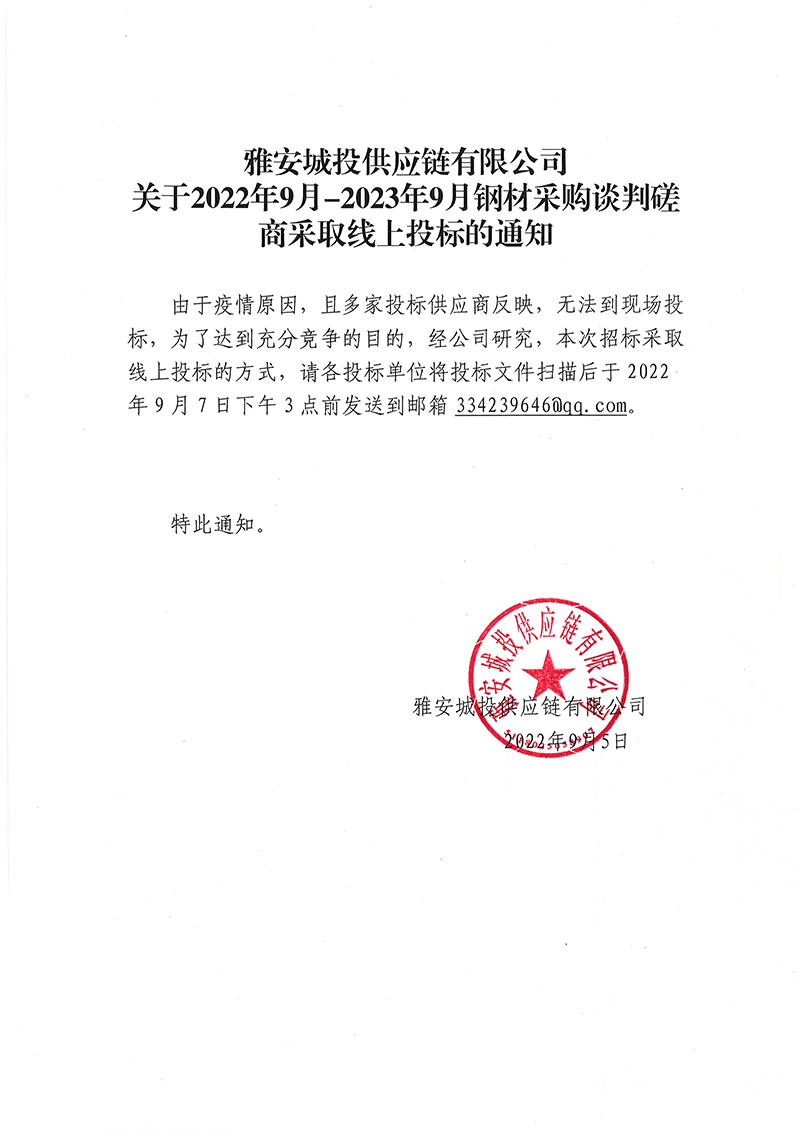 雅安城投供應(yīng)鏈有限公司關(guān)于2022年9月-2023年9月鋼材采購談判磋商采取線上投標的通知