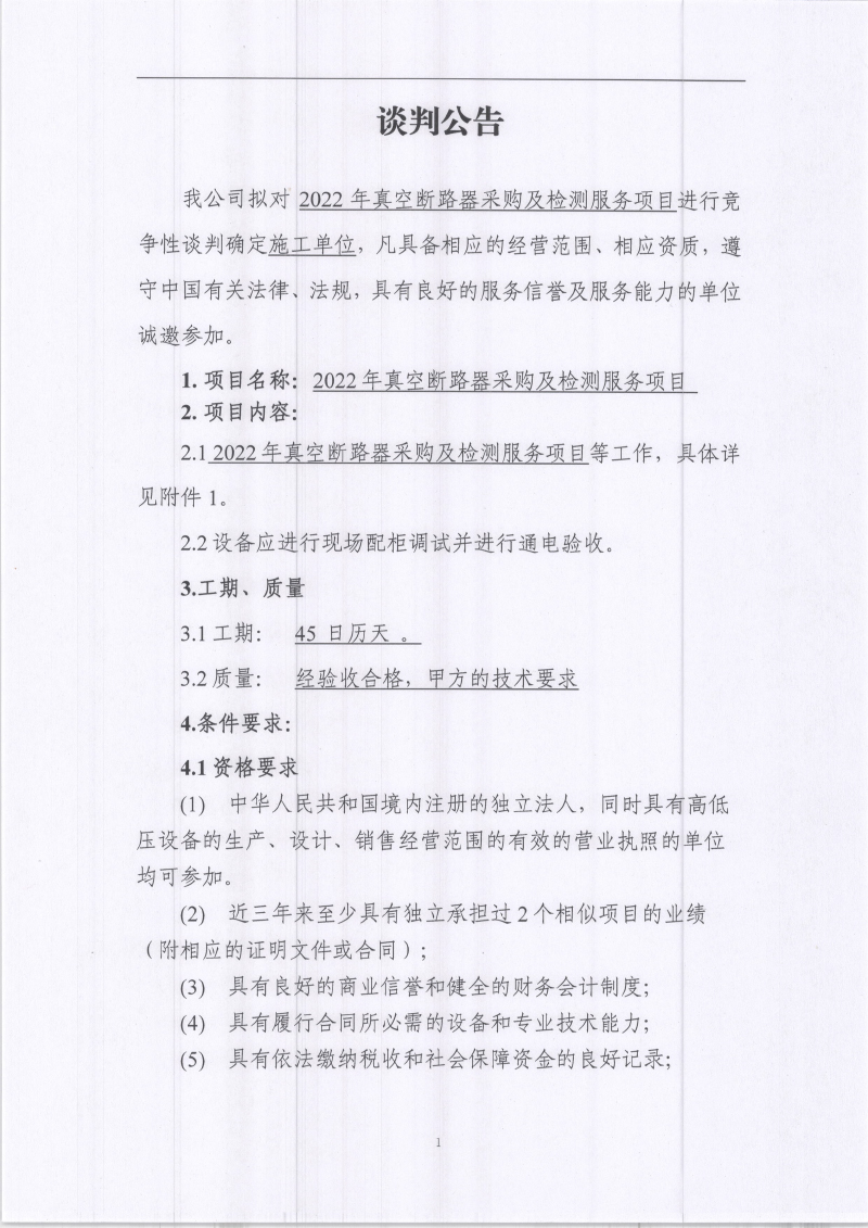 城利水電公司2022年真空斷路器采購及檢測(cè)服務(wù)項(xiàng)目競(jìng)爭(zhēng)性談判公告