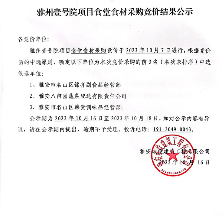 雅州壹號院項(xiàng)目食堂食材采購競價結(jié)果公示