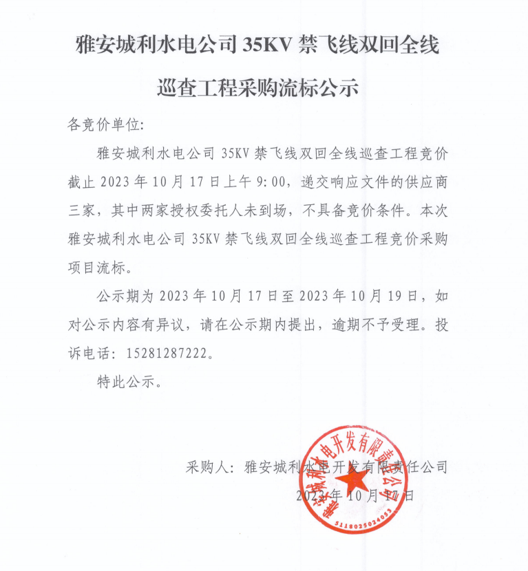 雅安城利水電公司35KV禁飛線雙回全線巡查工程采購流標公示