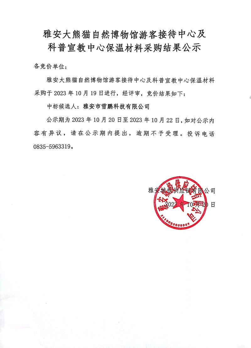 雅安大熊貓自然博物館游客接待中心及科普宣教中心保溫材料采購(gòu)結(jié)果公示
