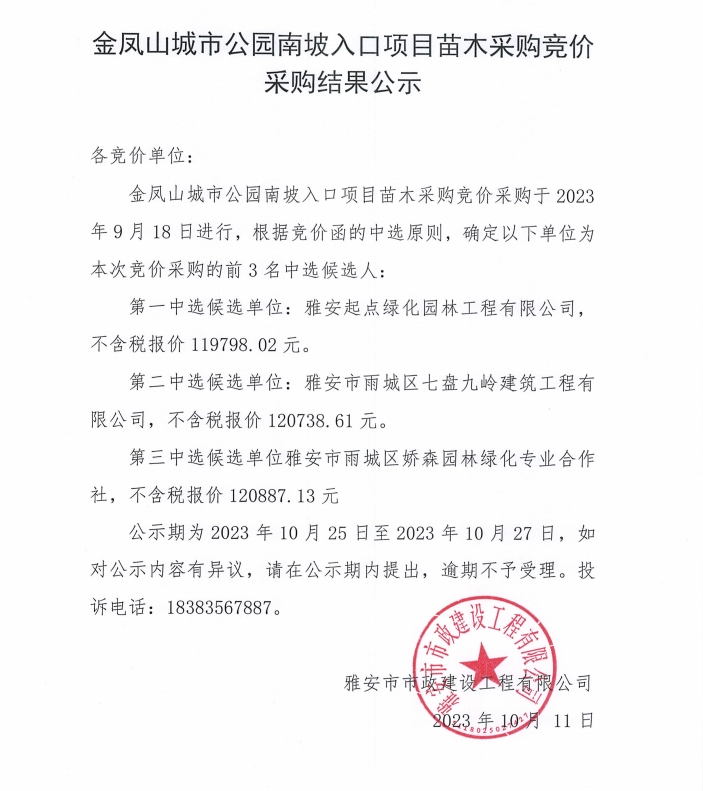 金鳳山城市公園南坡入口項目苗木采購競價采購結果公示