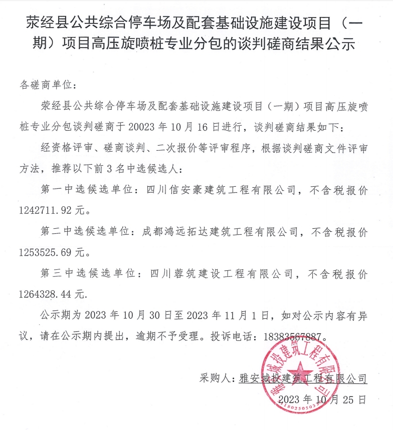 滎經(jīng)縣公共綜合停車場(chǎng)及配套基礎(chǔ)設(shè)施建設(shè)項(xiàng)目(一期)項(xiàng)目高壓旋噴樁專業(yè)分包的談判磋商結(jié)果公示