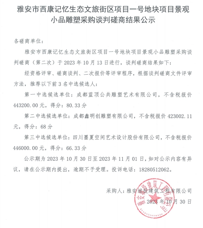 雅安市西康記憶生態(tài)文旅街區(qū)項(xiàng)目一號(hào)地塊項(xiàng)目景觀小品雕塑采購(gòu)談判磋商結(jié)果公示