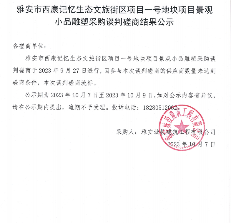 雅安市西康記憶生態(tài)文旅街區(qū)項(xiàng)目一號(hào)地塊項(xiàng)目景觀小品雕塑采購談判磋商結(jié)果公示