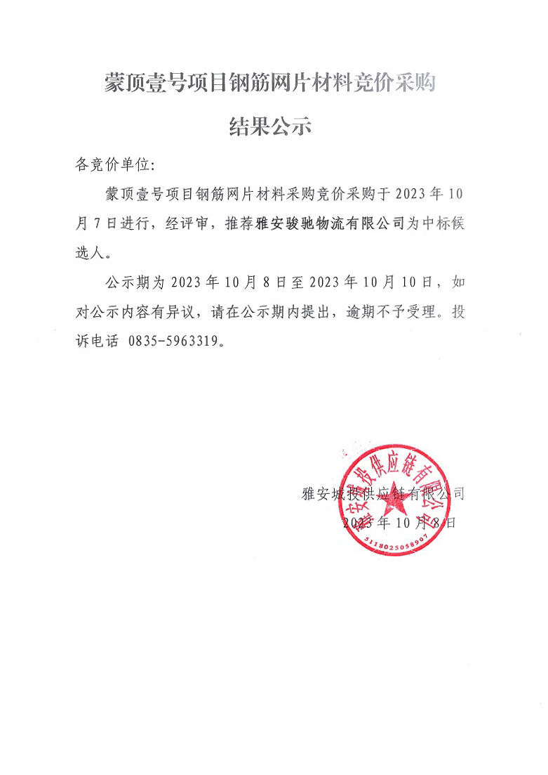 蒙頂壹號項目鋼筋網(wǎng)片材料競價采購結果公示