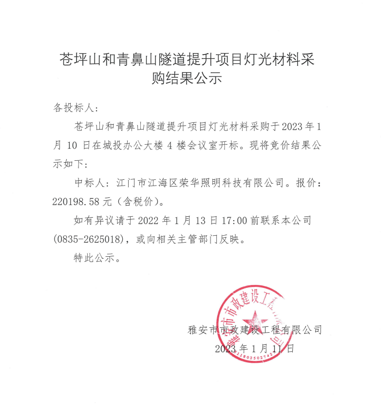 蒼坪山和青鼻山隧道提升項目燈光材料采購結(jié)果公示