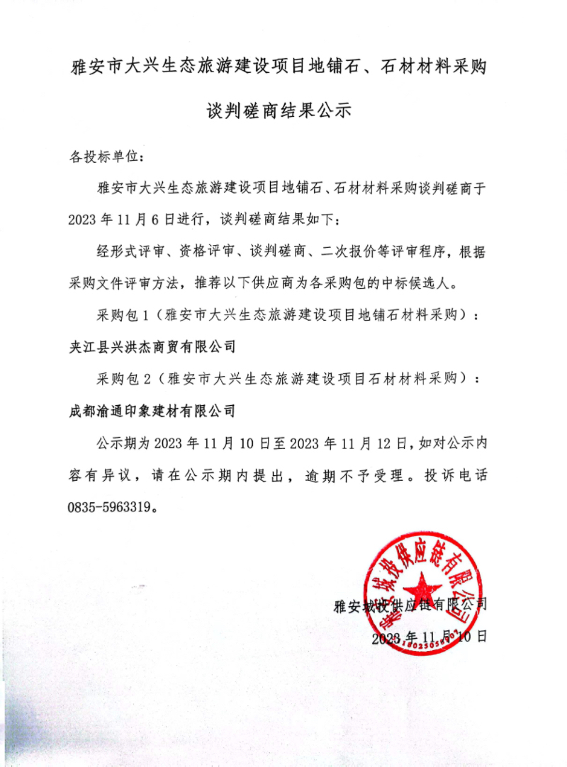 雅安市大興生態(tài)旅游建設(shè)項(xiàng)目地鋪石、石材材料采購(gòu)談判磋商結(jié)果公示