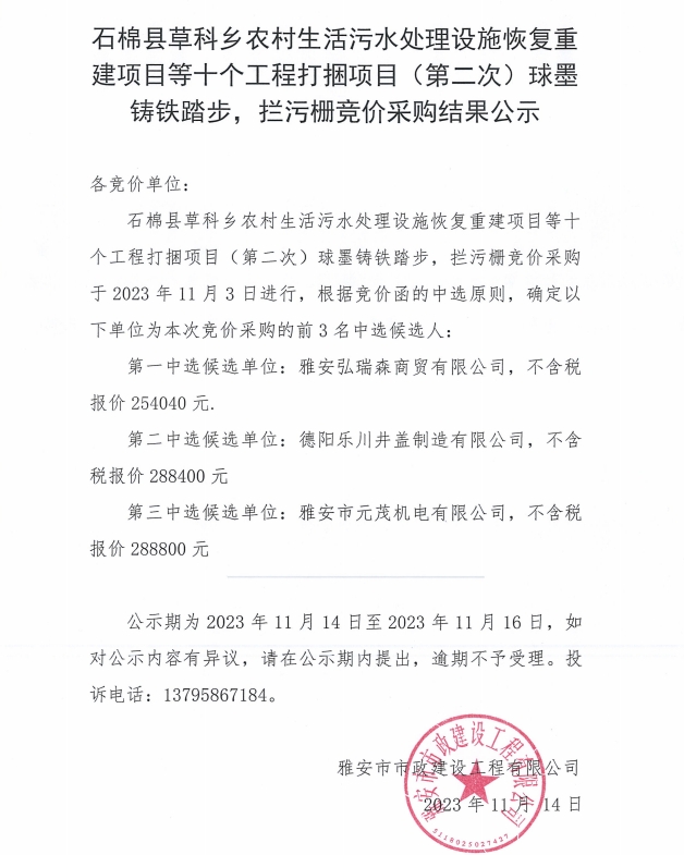 石棉縣草科鄉(xiāng)農村生活污水處理設施恢復重建項目等十個工程打捆項目(第二次)球墨鑄鐵踏步,攔污柵競價采購結果公示