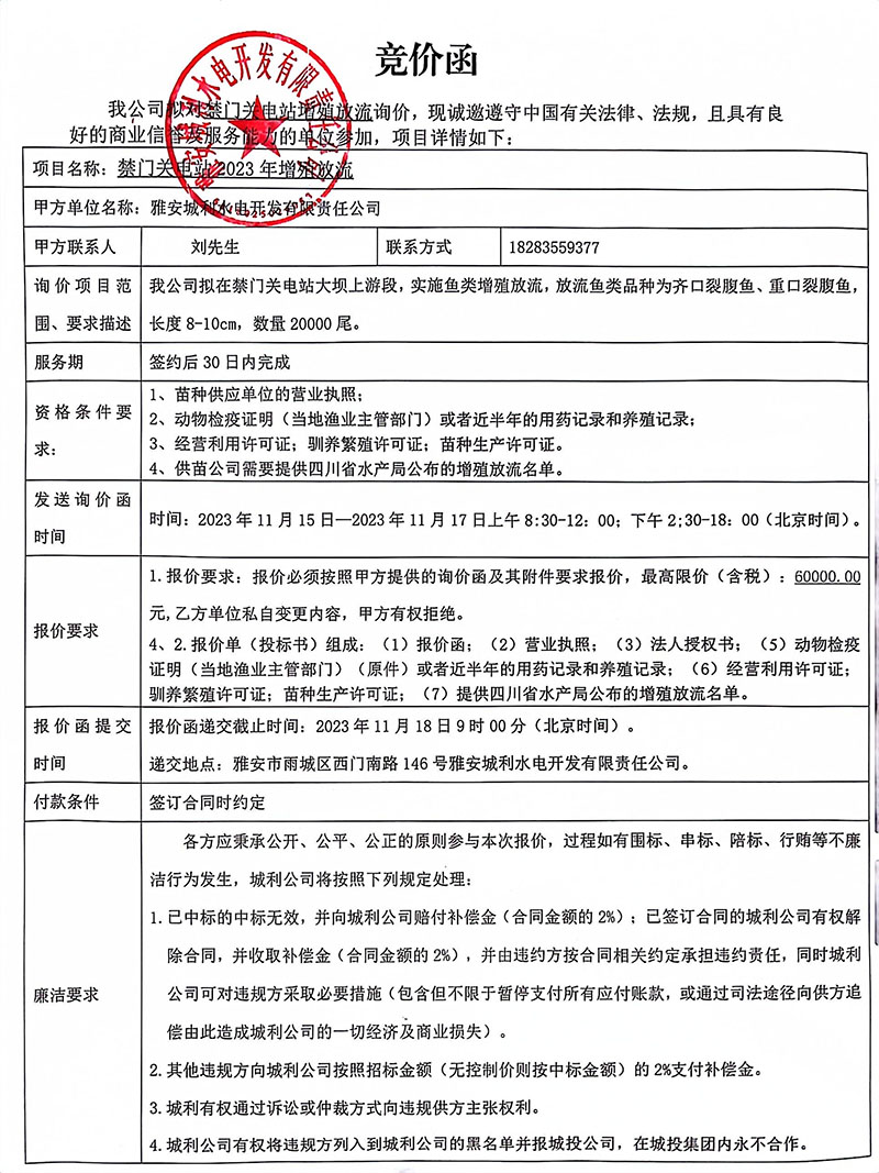 禁門(mén)關(guān)電站2023年增殖放流競(jìng)價(jià)公告