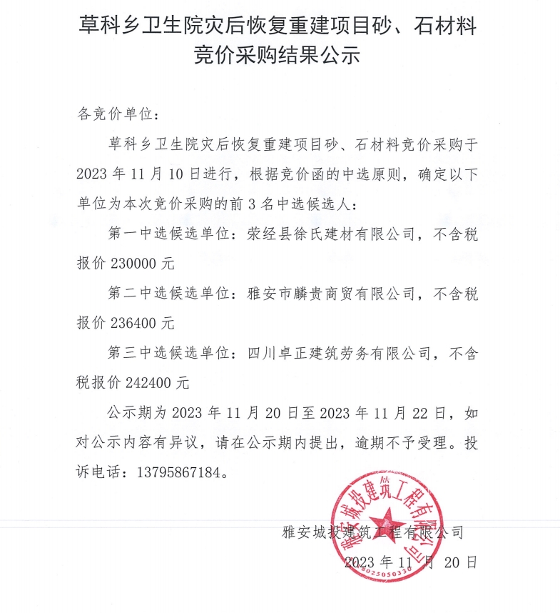 草科鄉(xiāng)衛(wèi)生院災(zāi)后恢復(fù)重建項(xiàng)目砂、石材料競(jìng)價(jià)采購(gòu)結(jié)果公示