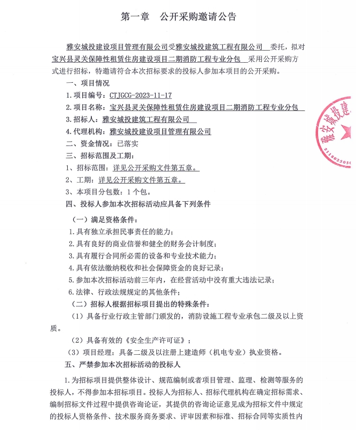 寶興縣靈關(guān)保障性租賃住房建設項目二期消防工程專業(yè)分包公開采購邀請公告