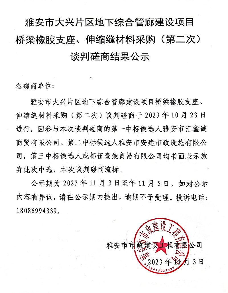 雅安市大興片區(qū)地下綜合管廊建設(shè)項(xiàng)目橋梁橡膠支座、伸縮縫材料采購(第二次)談判磋商結(jié)果公示