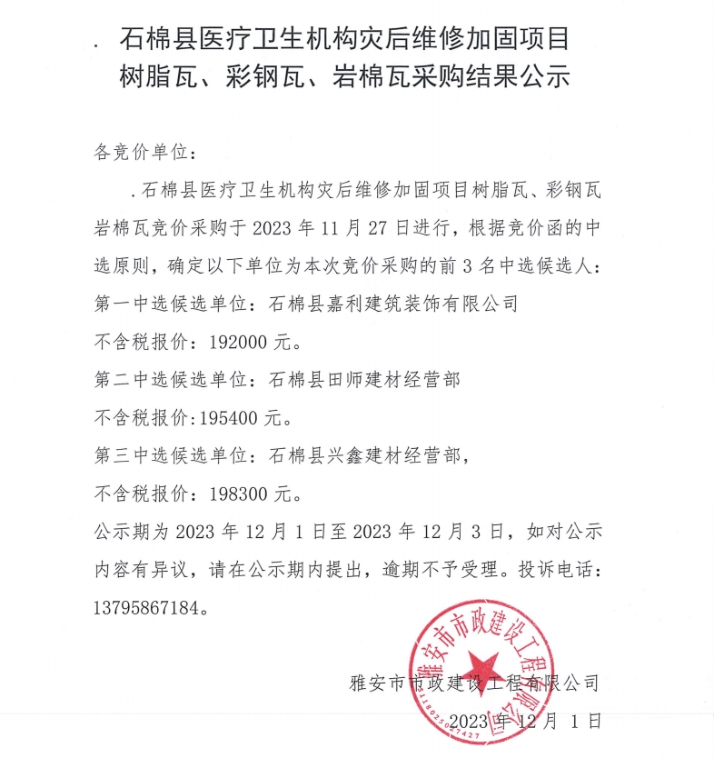 石棉縣醫(yī)療衛(wèi)生機構(gòu)災后維修加固項目樹脂瓦、彩鋼瓦、巖棉瓦采購結(jié)果公示