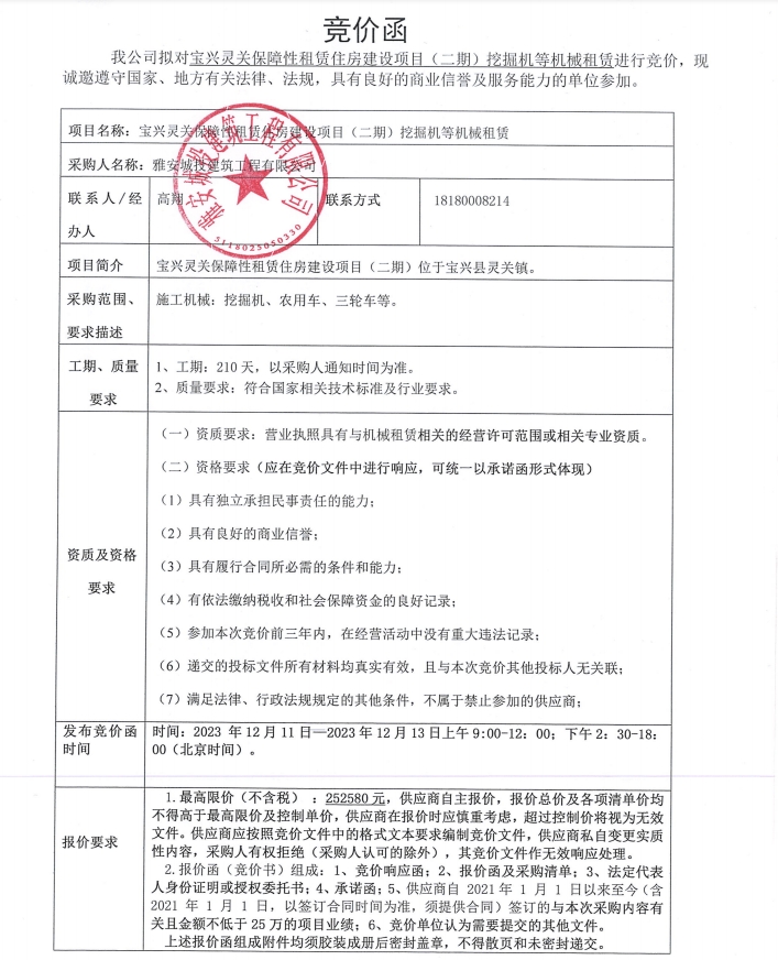 寶興靈關(guān)保障性租賃住房建設(shè)項(xiàng)目(二期)挖掘機(jī)等機(jī)械租賃競(jìng)價(jià)公告
