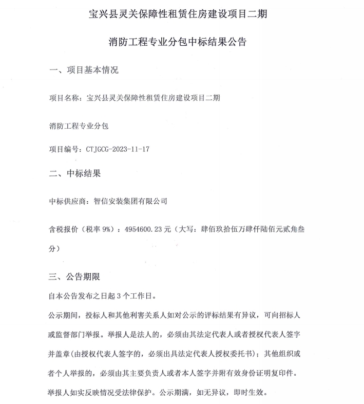 寶興縣靈關保障性租賃住房建設項目二期消防工程專業(yè)分包中標結果公告