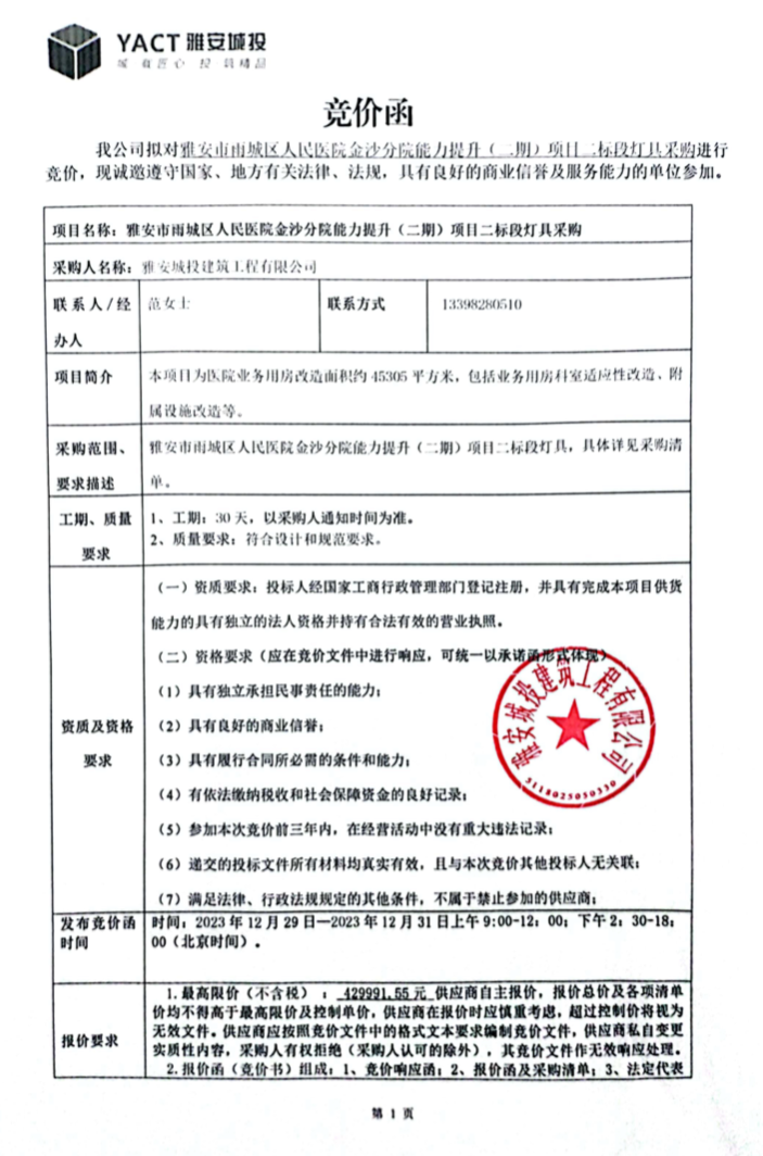 雅安市雨城區(qū)人民醫(yī)院分院能力提升(二期)項(xiàng)目二標(biāo)段燈具采購(gòu)競(jìng)價(jià)公告