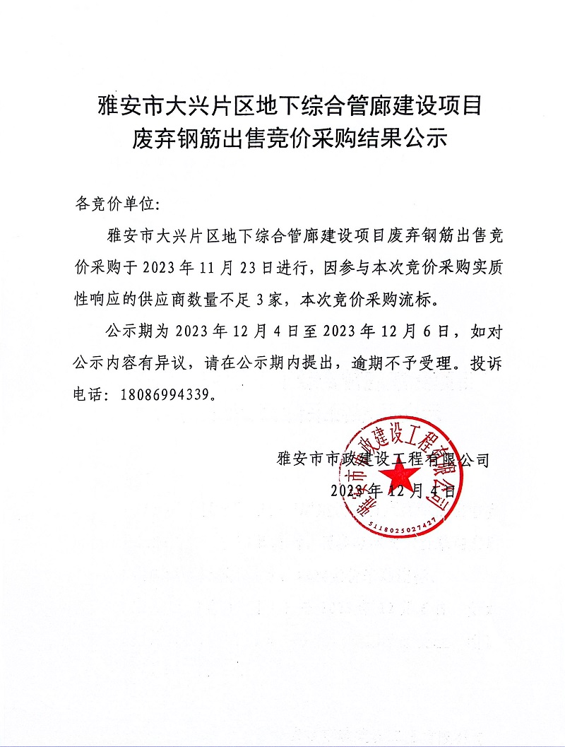雅安市大興片區(qū)地下綜合管廊建設(shè)項(xiàng)目廢棄鋼筋出售競(jìng)價(jià)采購(gòu)結(jié)果公示