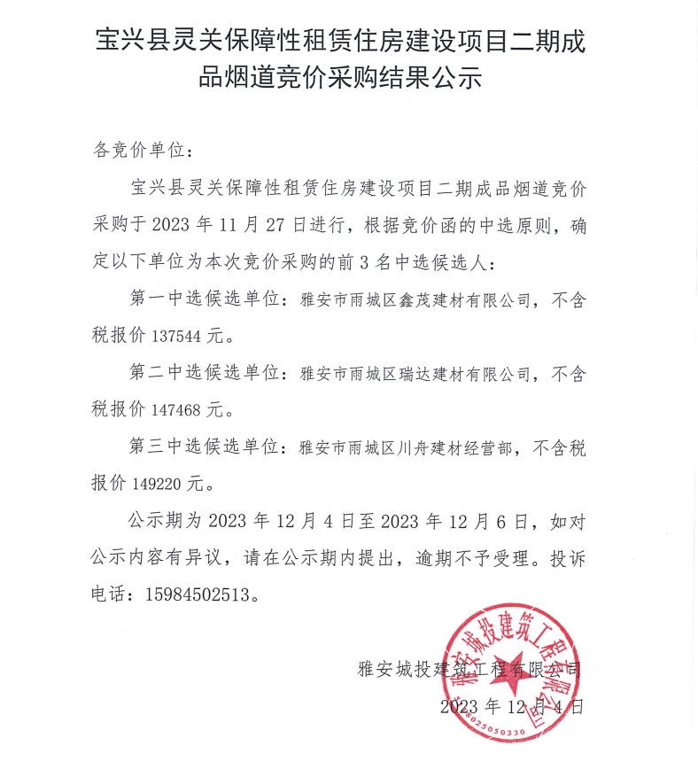 寶興縣靈關(guān)保障性租賃住房建設(shè)項(xiàng)目二期成品煙道競價采購結(jié)果公示