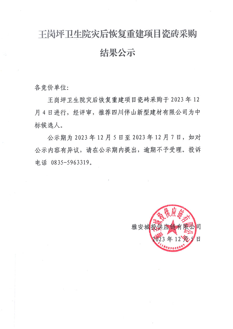 王崗坪衛(wèi)生院災后恢復重建項目瓷磚采購結(jié)果公示