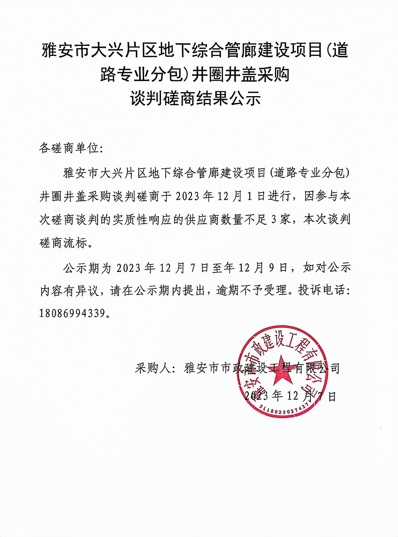 雅安市大興片區(qū)地下綜合管廊建設(shè)項(xiàng)目(道路專(zhuān)業(yè)分包)井圈井蓋采購(gòu)談判磋商結(jié)果公示
