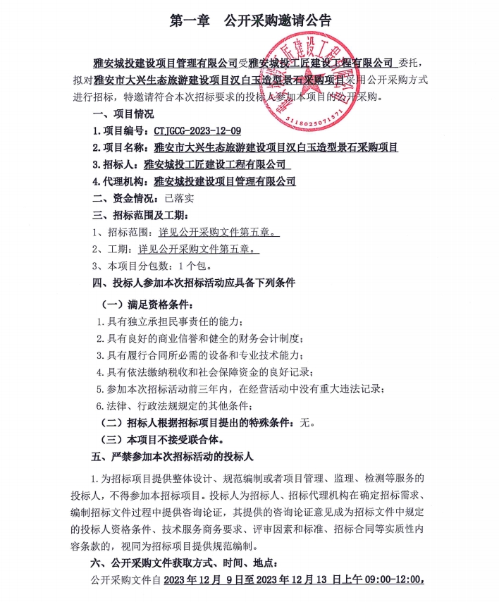 雅安市大興生態(tài)旅游建設(shè)項目漢白玉造型景石采購項目公開采購邀請公告