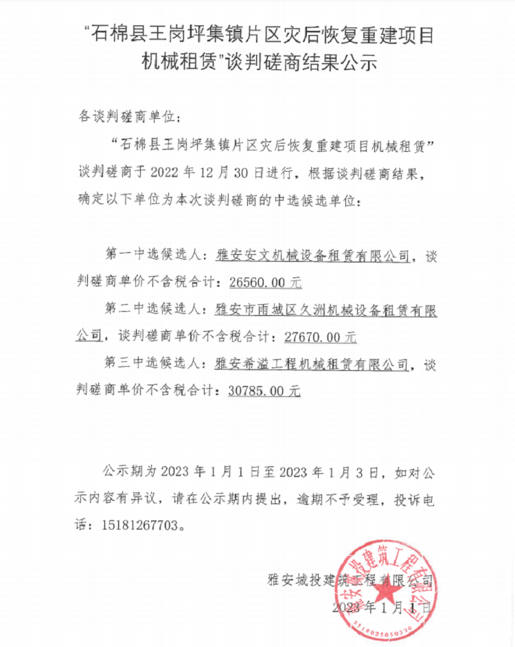 “石棉縣王崗坪集鎮(zhèn)片區(qū)災(zāi)后恢復(fù)重建項目機械租賃”談判磋商結(jié)果公示
