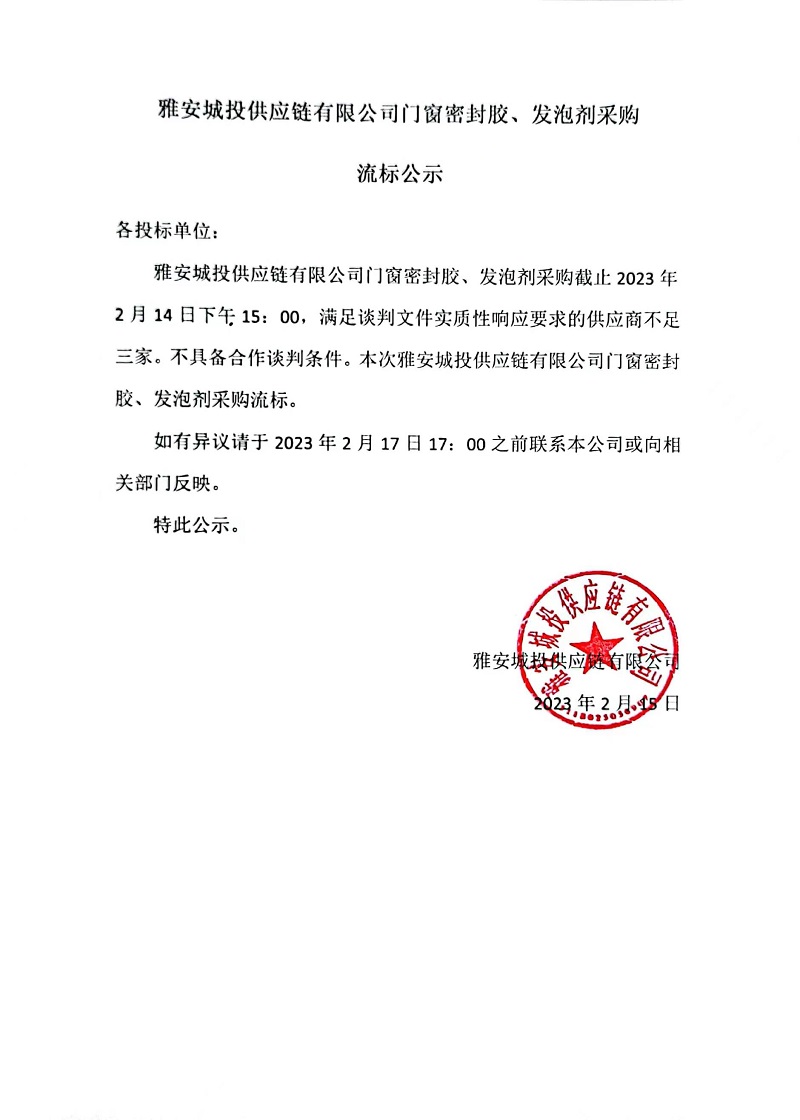 雅安城投供應(yīng)鏈有限公司門(mén)窗密封膠、發(fā)泡劑采購(gòu)流標(biāo)公示