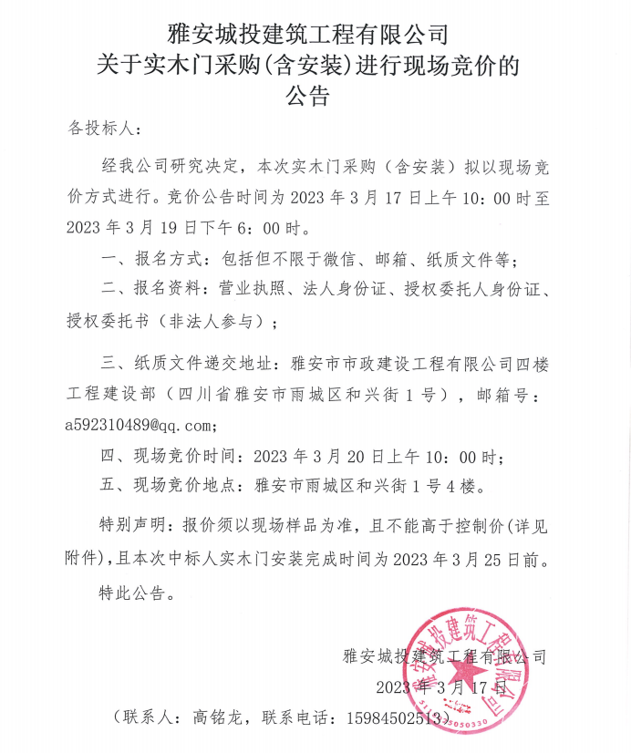 雅安城投建筑工程有限公司關(guān)于實(shí)木門采購(含安裝)進(jìn)行現(xiàn)場(chǎng)競(jìng)價(jià)的公告