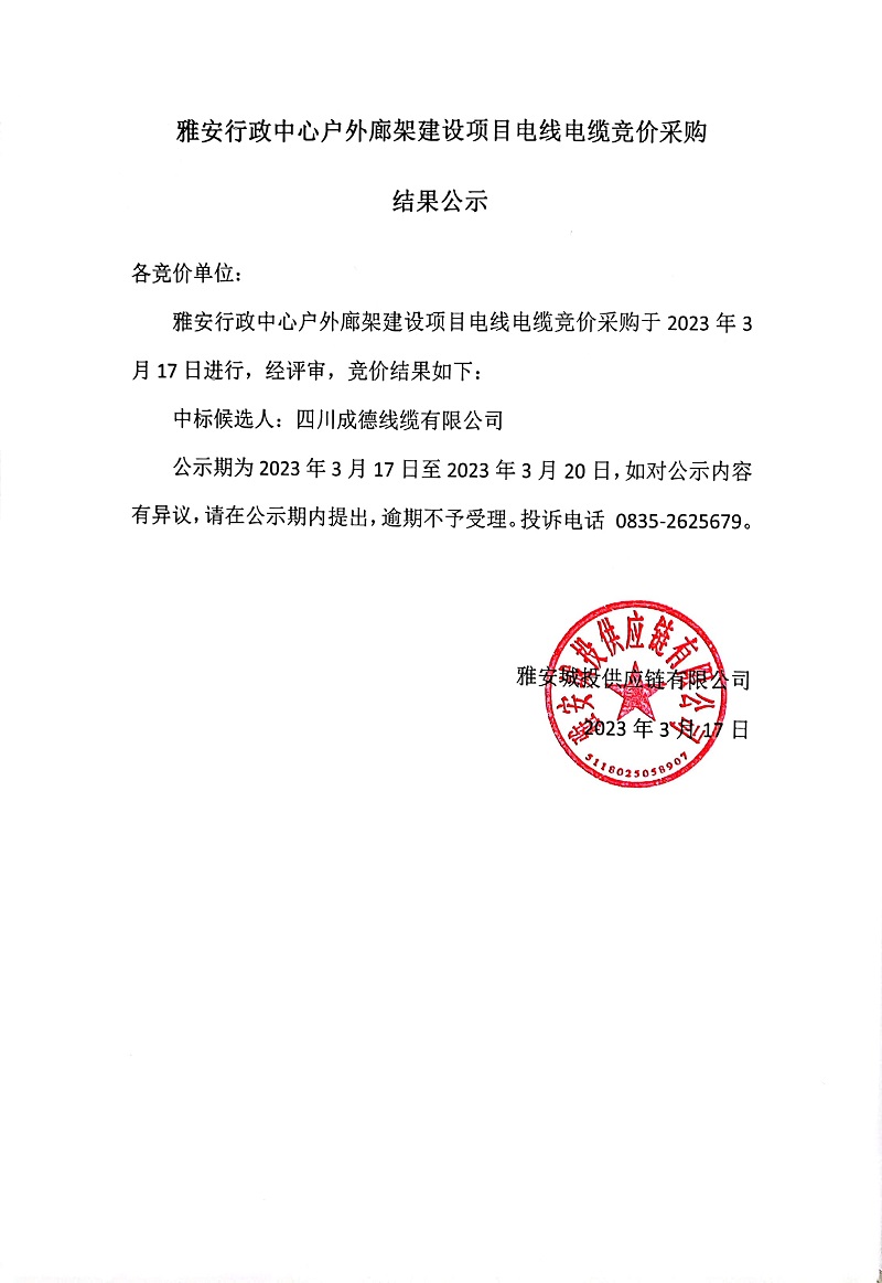 雅安行政中心戶外廊架建設項目電線電纜競價采購結果公示