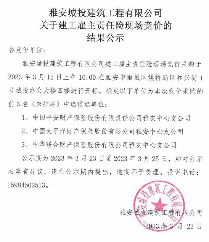 雅安城投建筑工程有限公司關于建工雇主責任險現(xiàn)場競價的結(jié)果公示