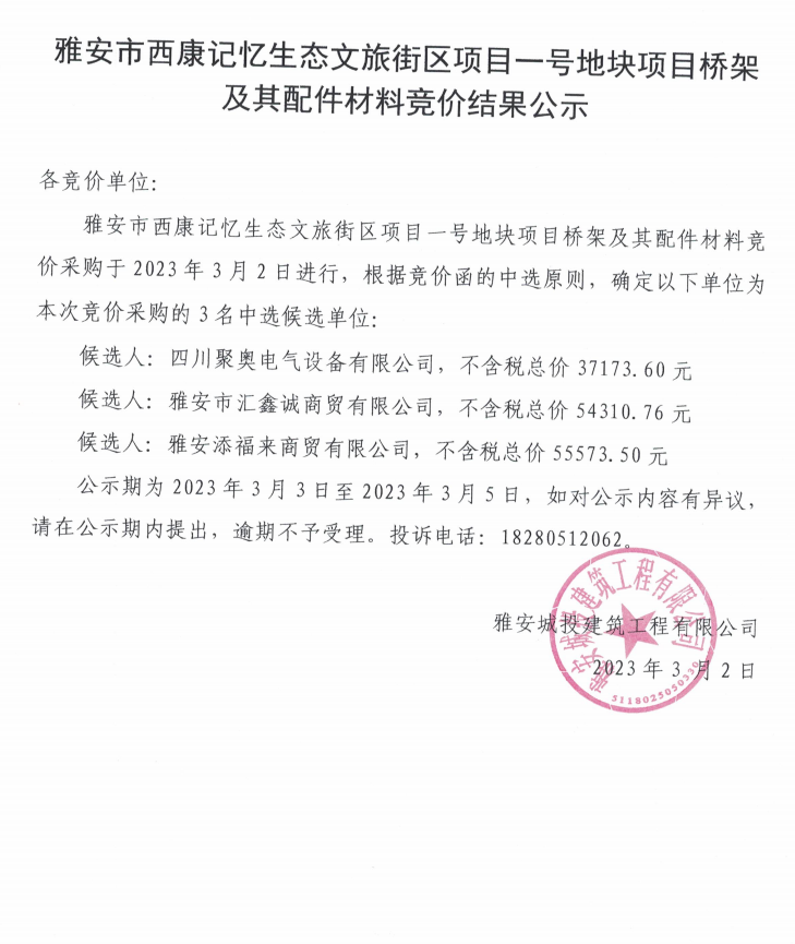 雅安市西康記憶生態(tài)文旅街區(qū)項(xiàng)目一號地塊項(xiàng)目橋架及其配件材料競價結(jié)果公示