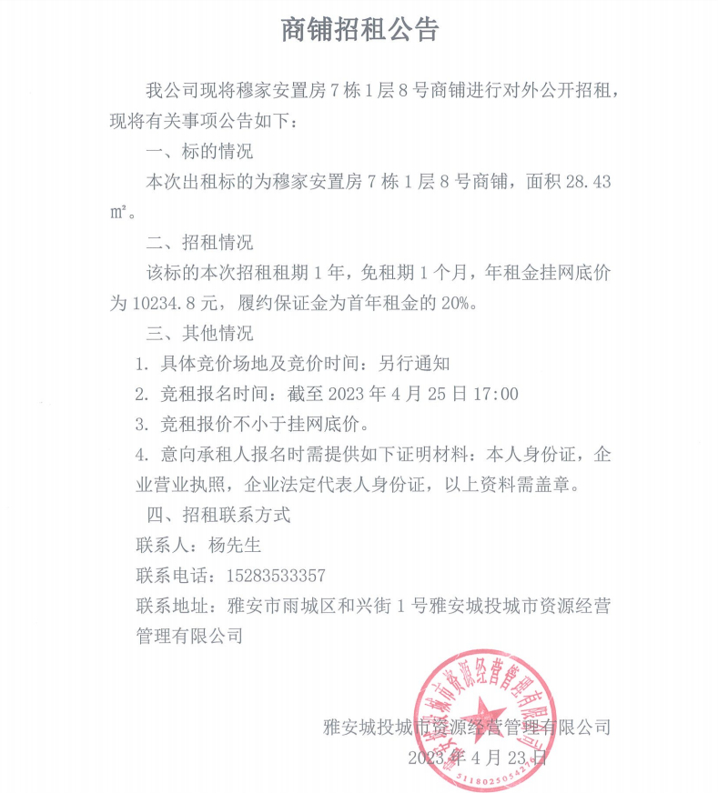穆家安置房7棟1層8號商鋪招租公告