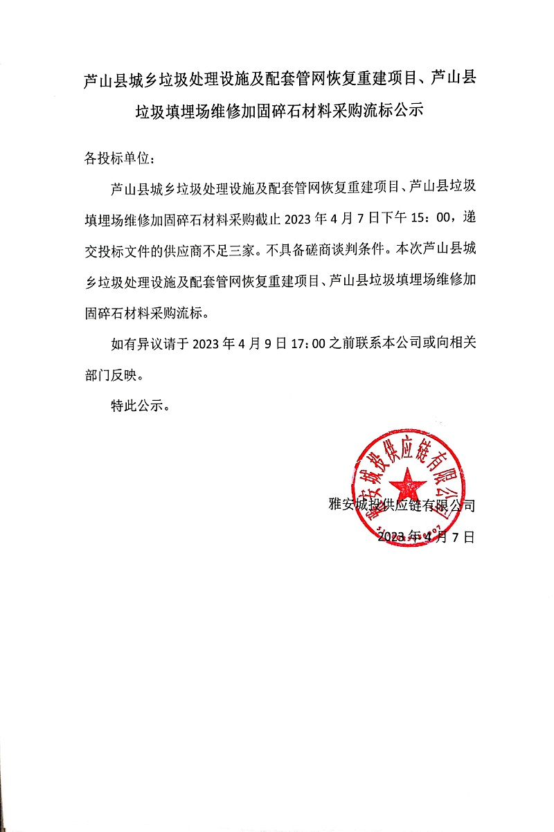 蘆山縣城鄉(xiāng)垃圾處理設(shè)施及配套管網(wǎng)恢復(fù)重建項(xiàng)目、蘆山縣垃圾填埋場維修加固碎石材料采購流標(biāo)公示