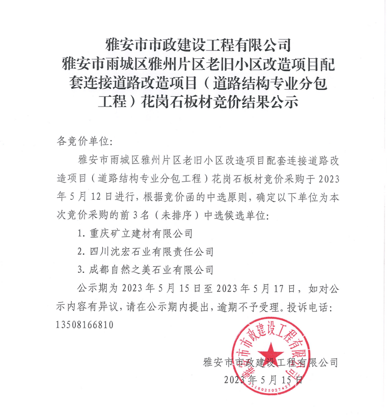 雅安市市政建設(shè)工程有限公司雅安市雨城區(qū)雅州片區(qū)老舊小區(qū)改造項(xiàng)目配套連接道路改造項(xiàng)目(道路結(jié)構(gòu)專業(yè)分包工程)花崗石板材競價結(jié)果公示