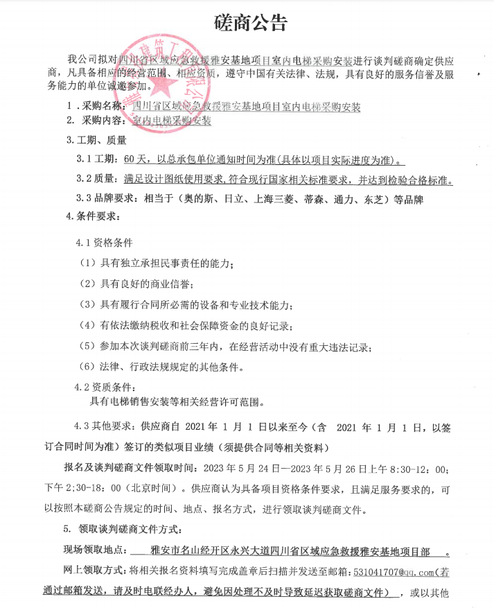 四川省區(qū)域應(yīng)急救援雅安基地項(xiàng)目室內(nèi)電梯采購安裝談判磋商公告