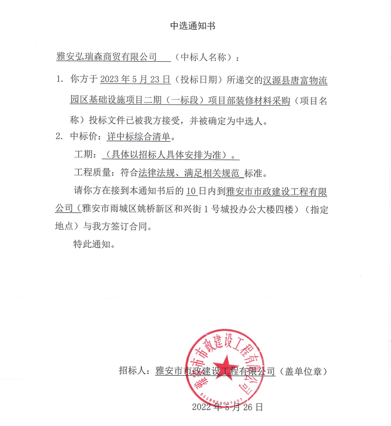 漢源縣唐富物流園區(qū)基礎設施項目二期(一標段)項目部裝修材料采購中選通知書