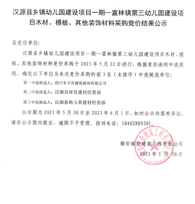 漢源縣鄉(xiāng)鎮(zhèn)幼兒園建設項目一期--富林鎮(zhèn)第三幼兒園建設項目木材、模板、其他裝飾材料采購競價結果公示