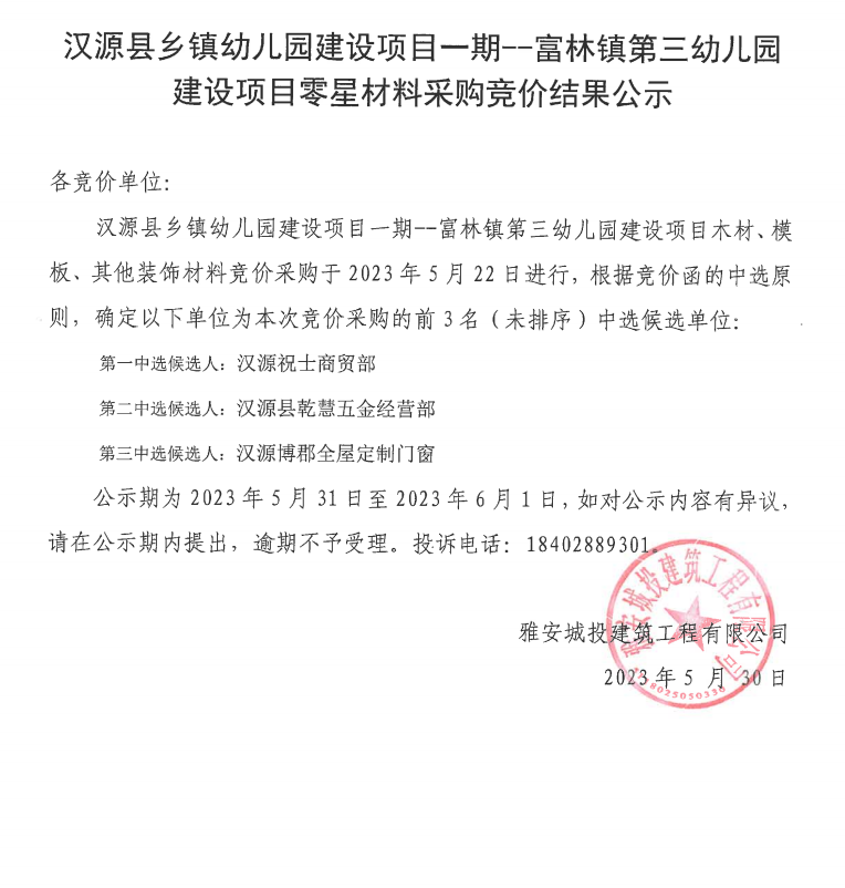 漢源縣鄉(xiāng)鎮(zhèn)幼兒園建設(shè)項(xiàng)目一期--富林鎮(zhèn)第三幼兒園建設(shè)項(xiàng)目零星材料采購競價(jià)結(jié)果公示