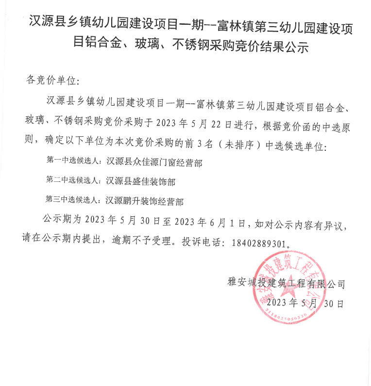 漢源縣鄉(xiāng)鎮(zhèn)幼兒園建設(shè)項(xiàng)目一期--富林鎮(zhèn)第三幼兒園建設(shè)項(xiàng)目鋁合金、玻璃、不銹鋼采購(gòu)競(jìng)價(jià)結(jié)果公示