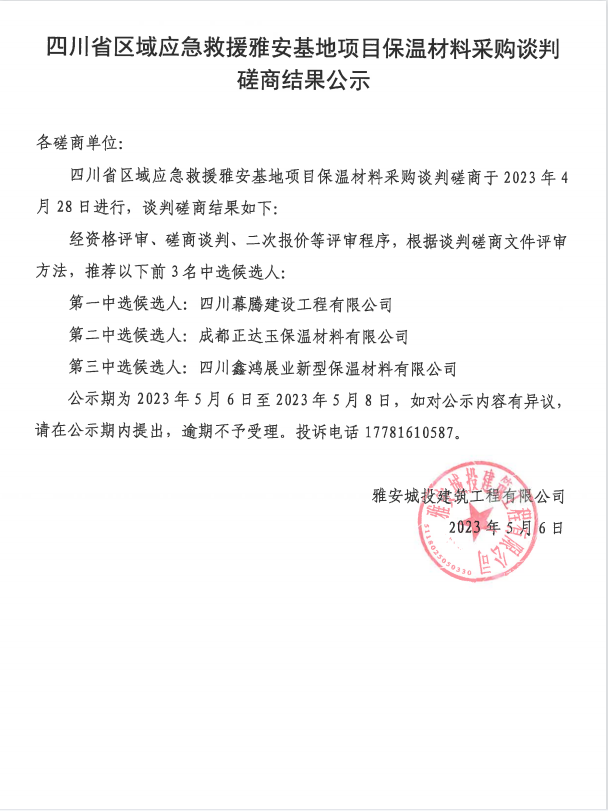 四川省區(qū)域應(yīng)急救援雅安基地項目保溫材料采購談判磋商結(jié)果公示