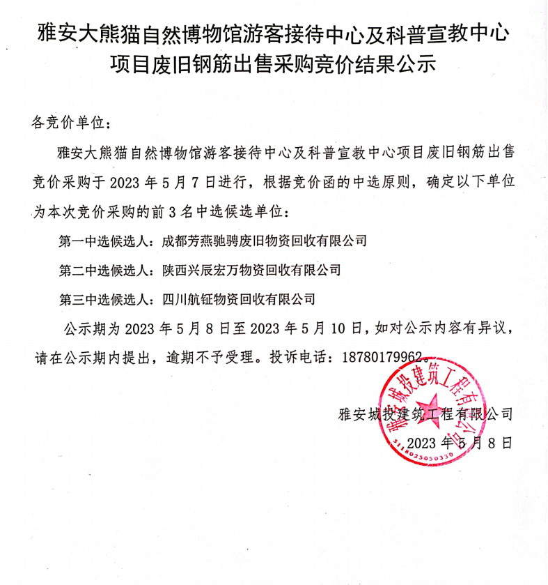 雅安大熊貓自然博物館游客接待中心及科普宣教中心項(xiàng)目廢舊鋼筋出售采購(gòu)競(jìng)價(jià)結(jié)果公示